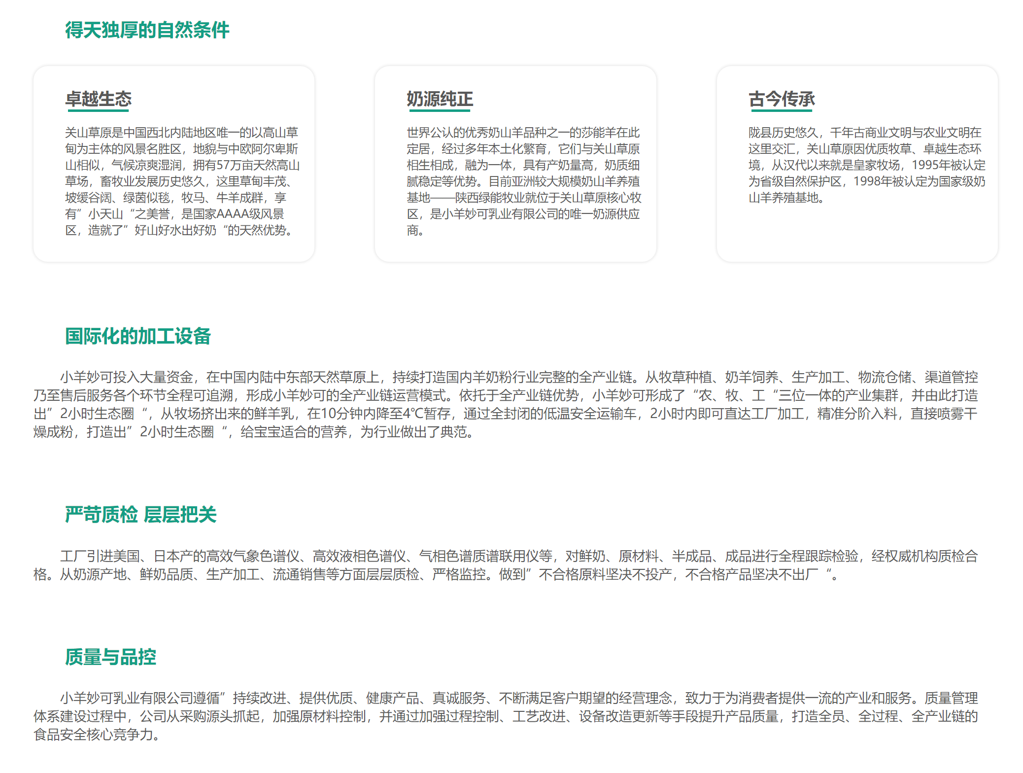 小羊妙可投入大量資金,在中國(guó)內(nèi)陸中東部天然草原上,持續(xù)打造國(guó)內(nèi)羊奶粉行業(yè)完整的全產(chǎn)業(yè)鏈。從牧草種植、奶羊飼養(yǎng)、生產(chǎn)加工、物流倉(cāng)儲(chǔ)、渠道管控乃至售后服務(wù)各個(gè)環(huán)節(jié)全程可追溯,形成小羊妙可的全產(chǎn)業(yè)鏈運(yùn)營(yíng)模式。依托于全產(chǎn)業(yè)鏈優(yōu)勢(shì),小羊妙可形成了“農(nóng)、牧、工“三位一體的產(chǎn)業(yè)集群,并由此打造出”2小時(shí)生態(tài)圈“,從牧場(chǎng)擠出來(lái)的鮮羊乳,在10分鐘內(nèi)降至4℃暫存,通過(guò)全封閉的低溫安全運(yùn)輸車,2小時(shí)內(nèi)即可直達(dá)工廠加工,精準(zhǔn)分階入料,直接噴霧干燥成粉,打造出”2小時(shí)生態(tài)圈“,給寶寶適合的營(yíng)養(yǎng),為行業(yè)做出了典范。