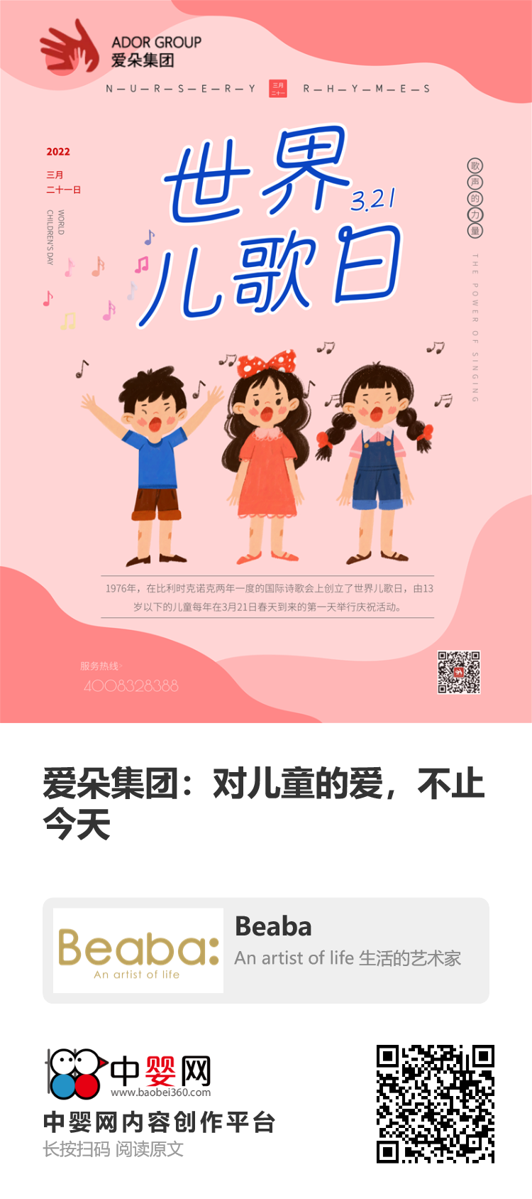 1976年,在比利時克諾克兩年一度的國際詩歌會上創立了世界兒歌日,由13歲以下的兒童每年在3月21日(二十四節氣中的第四個節氣春分)——春天到來的天舉行慶祝活動。主題是:關愛兒童、締造和平、消滅戰爭、建設家園。該項活動得到了聯合國教科文組織的認可和支持。每年這一天,各國兒童組織、教育機構用各種形式慶祝這一節日。